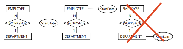 이 추가적인 Attribute는 두 Entity나 Relationship에 속하게 될 수 있는데, 각각의 경우는 Cardinality에 따라 가능한 경우들이 달라진다.