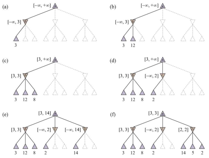 Alpha-Beta Pruning은 이러한 상/하계를 $\alpha, \beta$라는 변수로 관리하며 검색을 중단한다.