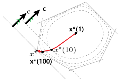 1 2 3 4 5 6 7 8 9 10 11 12 t = 10 mu = 10 tolerance = 1e-5 while True: initial_x = x step = minimize(t*f0(x) + phi, subject_to= (lambda x: Ax=b)) x = last_optimal if m / t < tolerance: break t = mu*t(t마다 Initial_x의 값을 계속 변화시키면서 Optimal을 찾는다.)