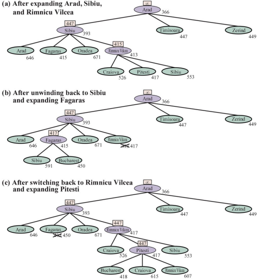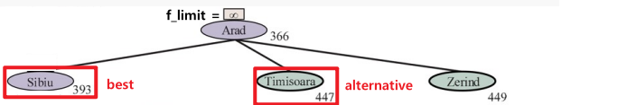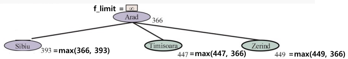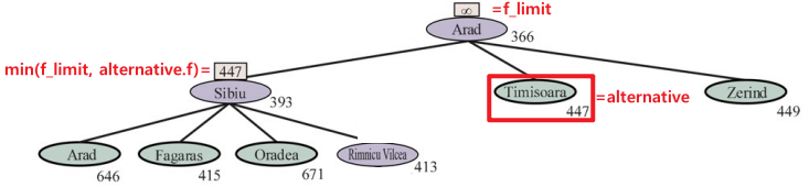 1 2 3 4 5 6 7 8 9 10 11 12 13 14 15 16 def RBFS(graph, start): solution, f = _RBFS(graph, start, 1e9) def _RBFS(graph, node, f_limit): children = expand(node, graph) if children.is_empty: return False, 1e9 for child in children: child.f = max(child.cost + h(child), node.f) while True: child.sort() best, alternative = child[0], child[1] if best.f > f_limit: return False, best.f result, best.f = _RBFS(graph, best, f_limit = min(f_limit, alternative.f)) if result != False: return result, best.f