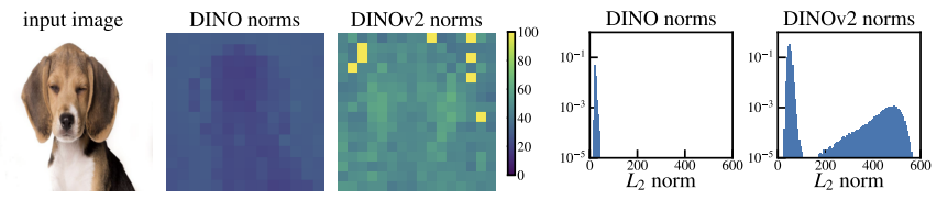 우리는 Artifact에 대한 정량적인 특징을 찾고 싶었고, 실험 결과 Token embedding의 norm에서 다른 patch들과 차이가 있다는 것을 발견했다. 위의 그림을 보면 알 수 있듯이 이미지에서 매우 적은 부분에서 high-norm을 갖는 Token이 있는 것을 알 수 있다.