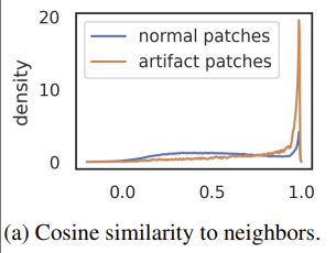 Patch embedding Layer(ViT의 첫번째 Layer)에서 각 Token들에 대해 이웃한 4방향의 Token들과 Cosine Similarity를 비교하였다. 그 결과 High-norm token(Artifact Patch)들은 주변 Token들과 유사했다는 것을 알 수 있는데, 이는 앞서 정의 부분에서 보았던 그림의 정성적 비교(Background에 Artifact 존재)와도 일치한다.