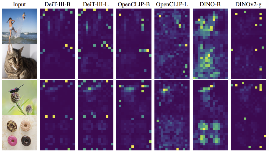 [CLS] 토큰의 Attention map을 보여주는 것은 DINO에서 널리 알려졌다. DINO에서는 이전의 Transformer들과는 달리 Attention map이 Artifact없이 깨끗하게 나타나는 것을 보여주었다. 이후 연구에서는 다양한 기법을 사용해 이러한 Attention map을 관찰하였다.